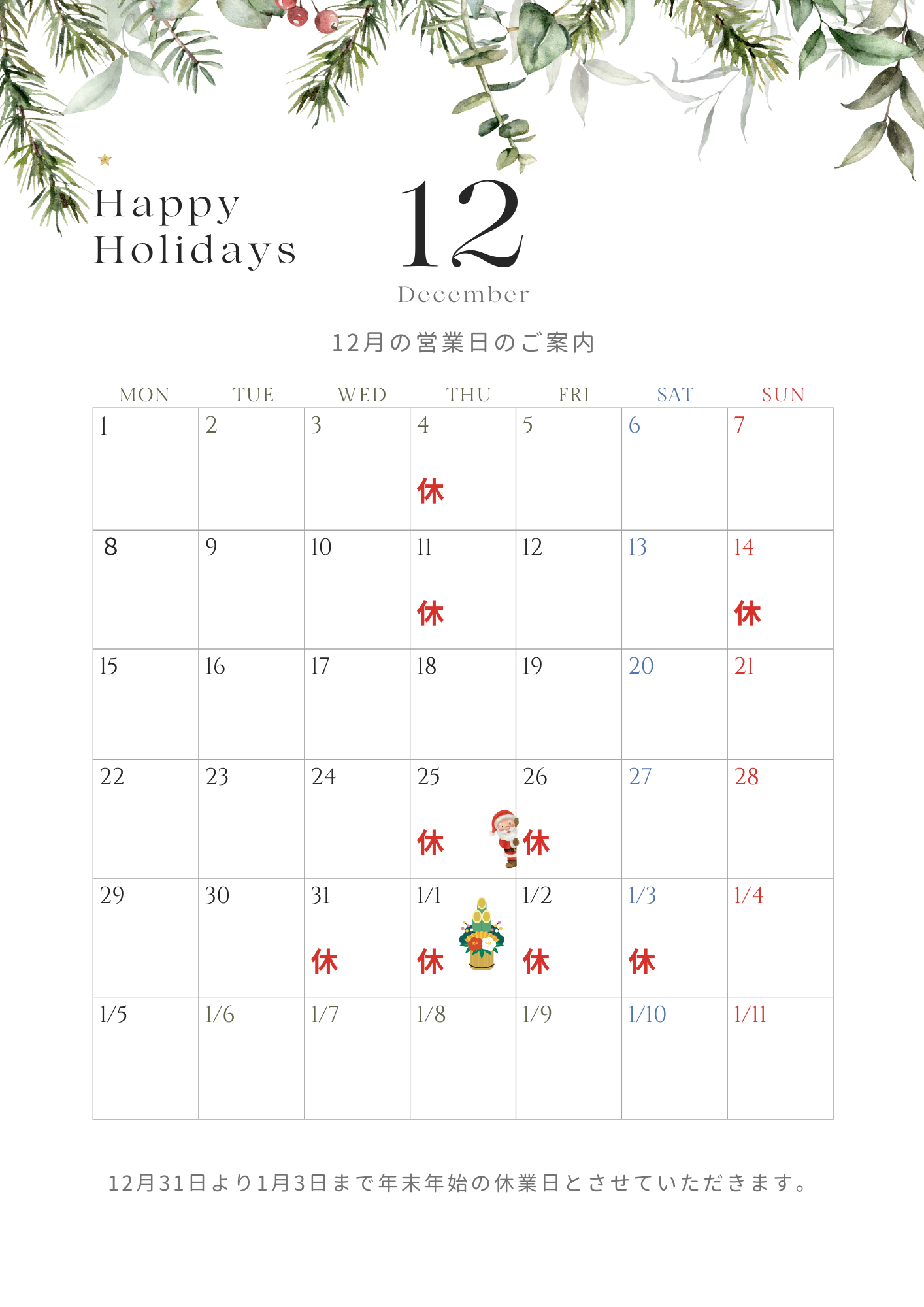 12月のお休みは4日(木)、11日(木)、14日(日)、25日(木)、26日(金)、31日(水)です。